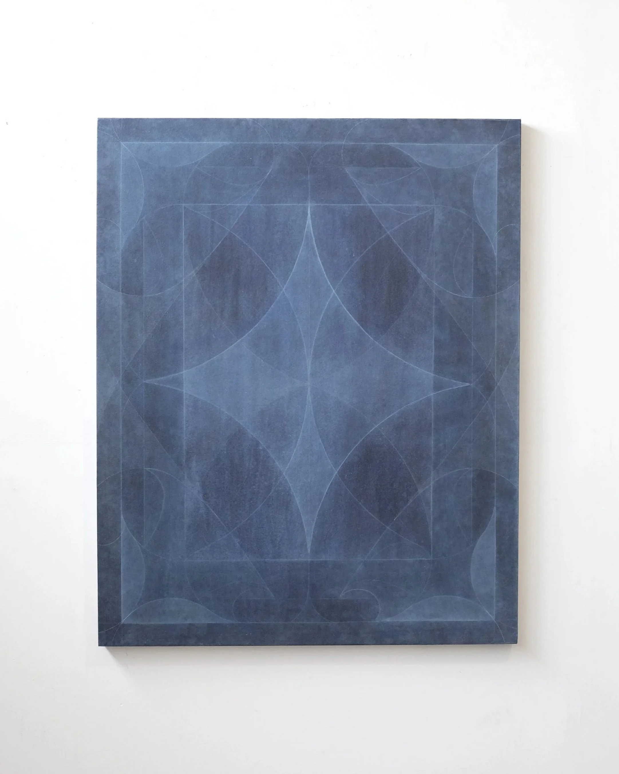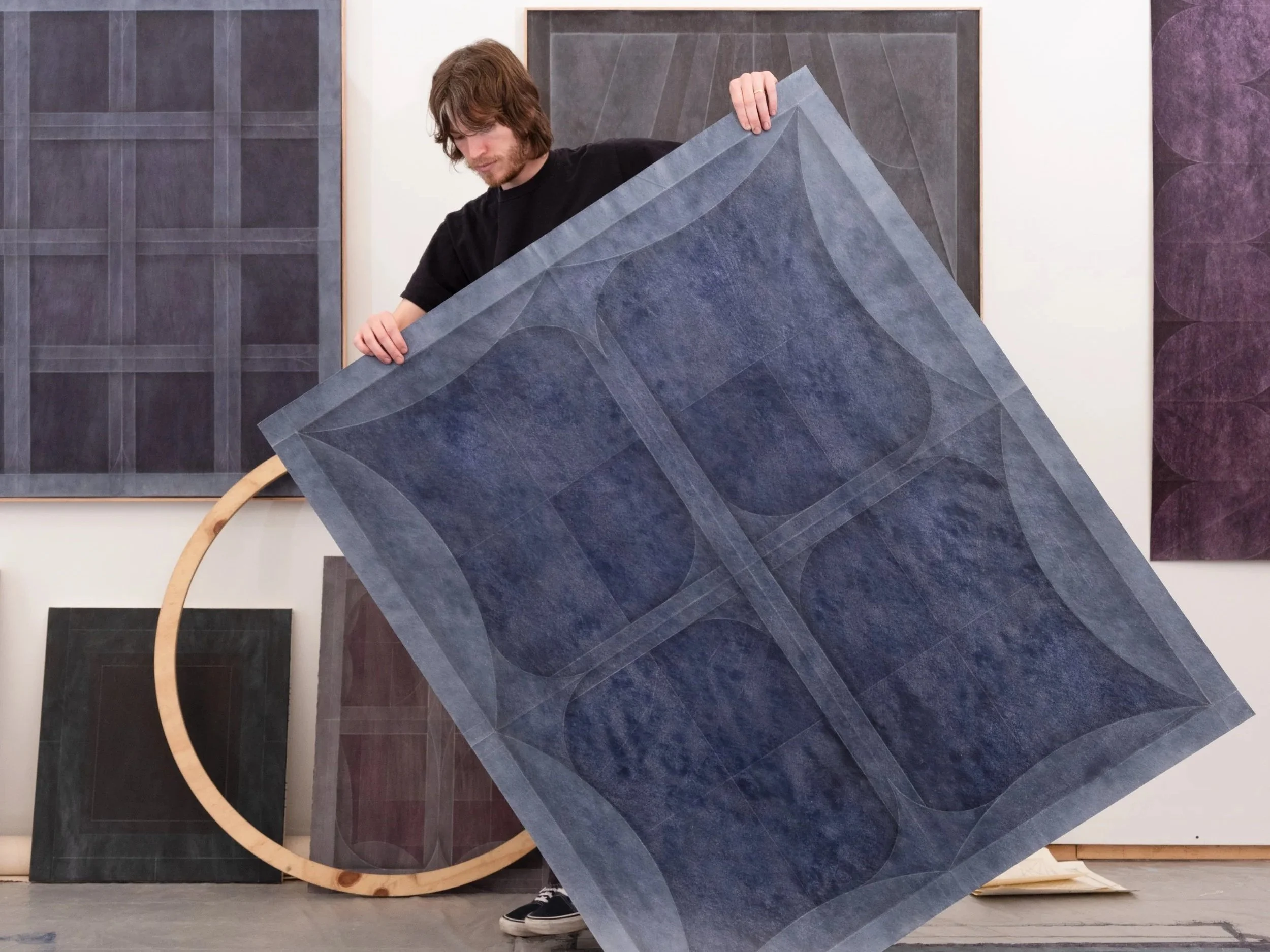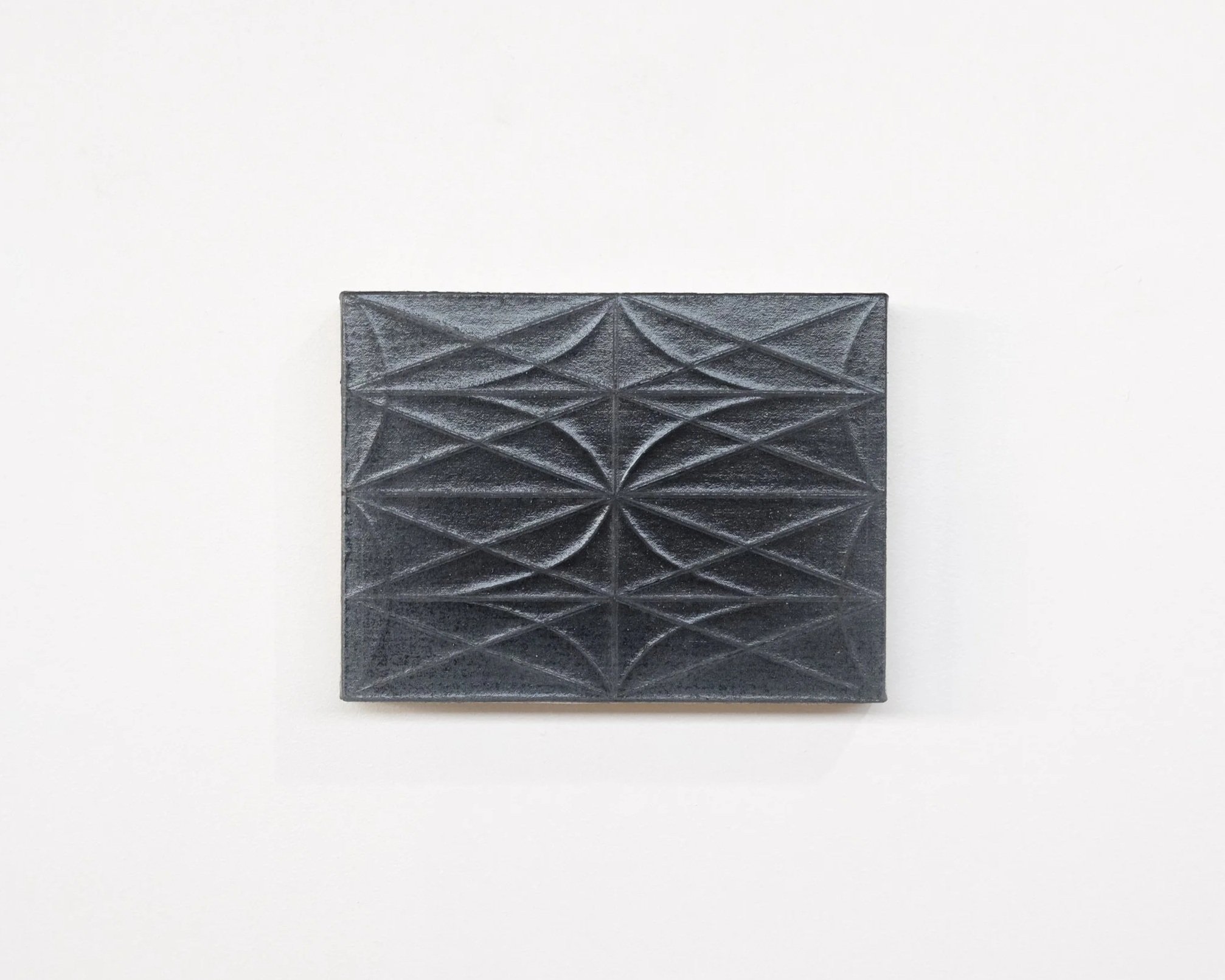Considering mapping, movement, and the cosmos, the work is a meditative dialogue between a material’s history and Nichols’ hand. Through creasing the primed material before adding layered planes of ground, he records memories of the physical stress on the surfaces. Formerly folded valleys deny pigmentation, joining and criss-crossing, forming linear radial patterns. Subtle, structural troughs contrast shapes accumulated by layering grisaille planes of dye and paint.